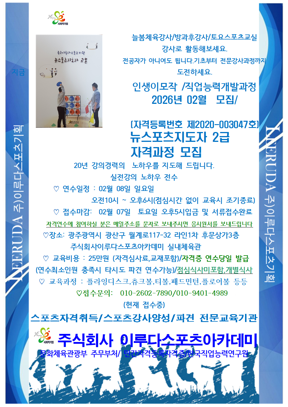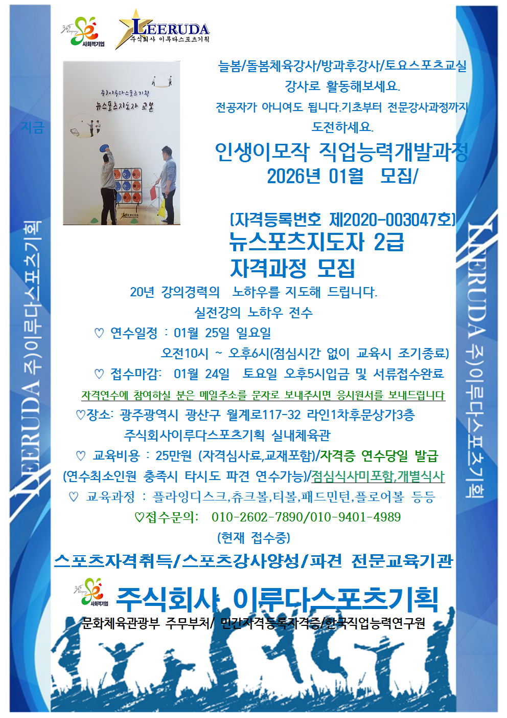 | 163 | 2025년12월 /뉴스포츠지도자 2급자격과정/2026년 방과후 강사 준비반/12월21일 일요일.. | 이루다스포츠기획 | 2025.11.30 | |