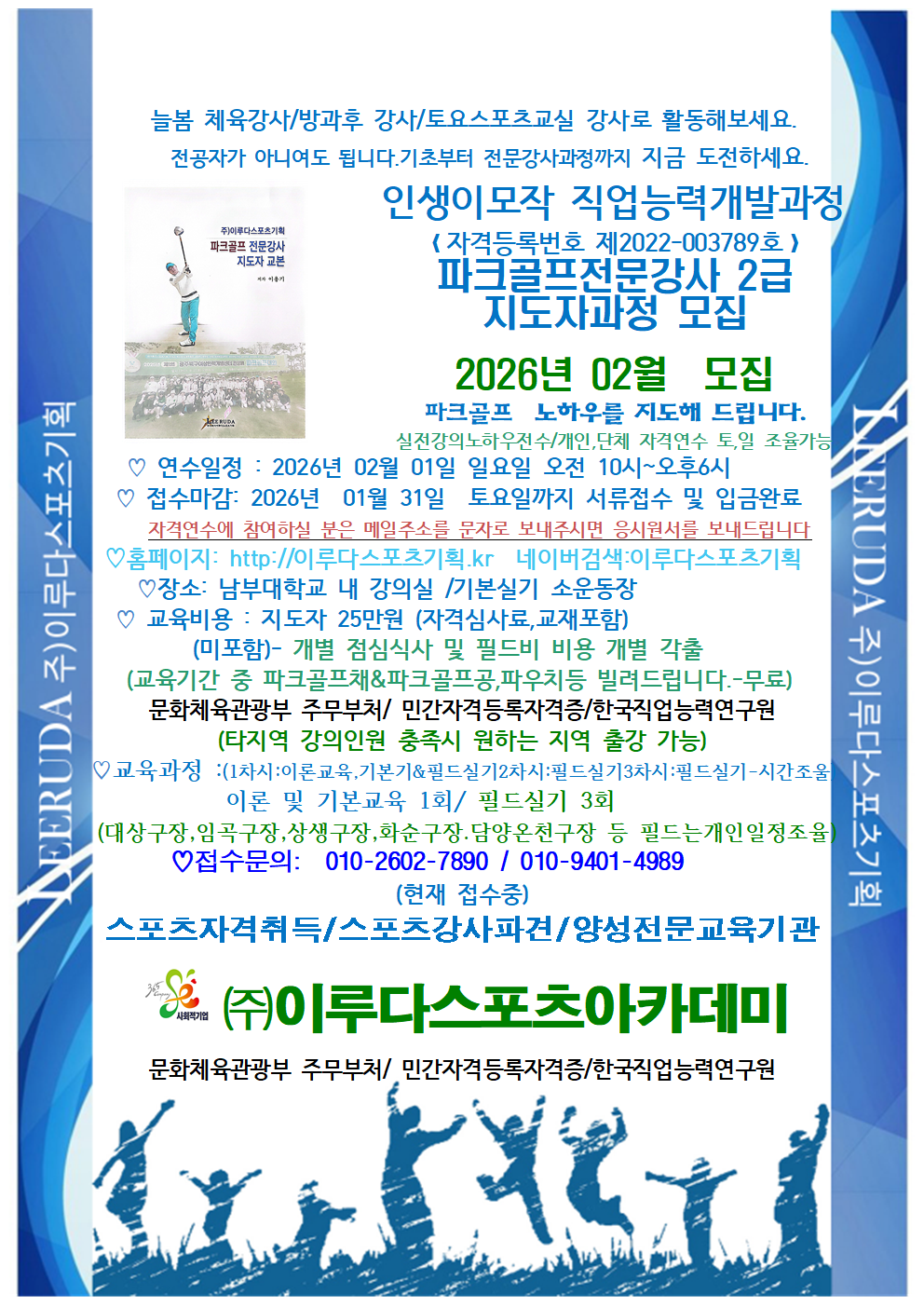 | 169 | 새글 파크골프전문강사 2급 지도자과정/자격과정/2026년2월/현재접수중 | 이루다스포츠기획 | 2026.01.26 | |