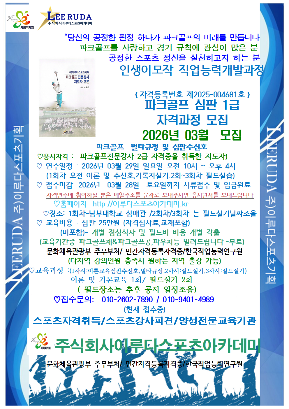 | 169 | 파크골프전문강사 2급 지도자과정/자격과정/2026년2월/현재접수중 | 이루다스포츠기획 | 2026.01.26 | |