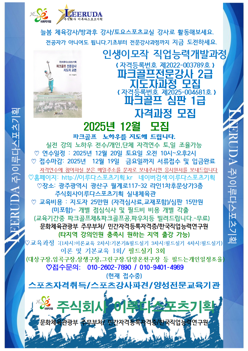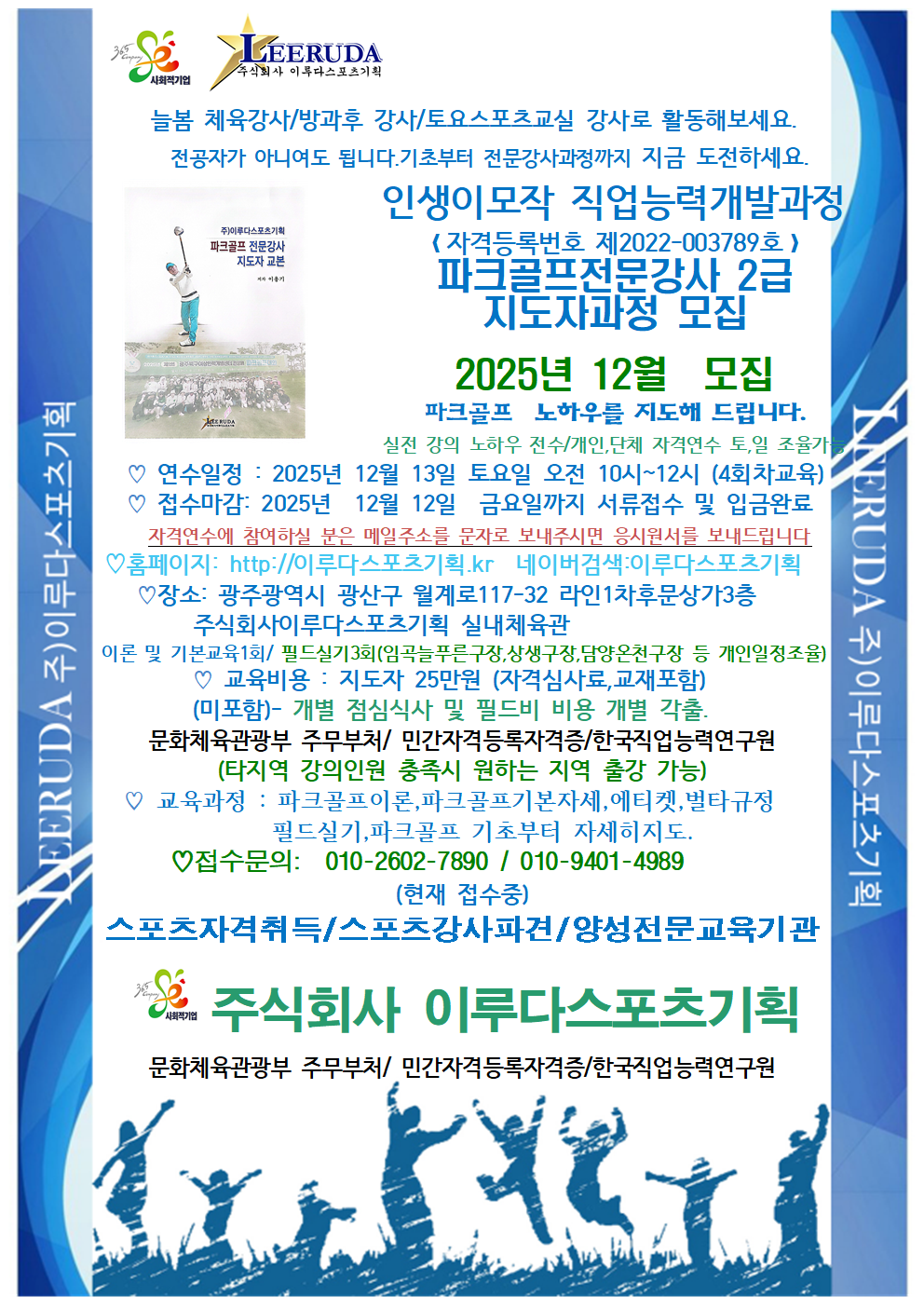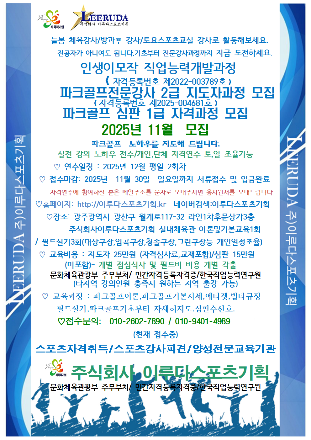 | 164 | 2025년12월 /파크골프전문강사 2급자격과정/민간자격증등록자격증/12월20일토요일/현재.. | 이루다스포츠기획 | 2025.11.30 | |