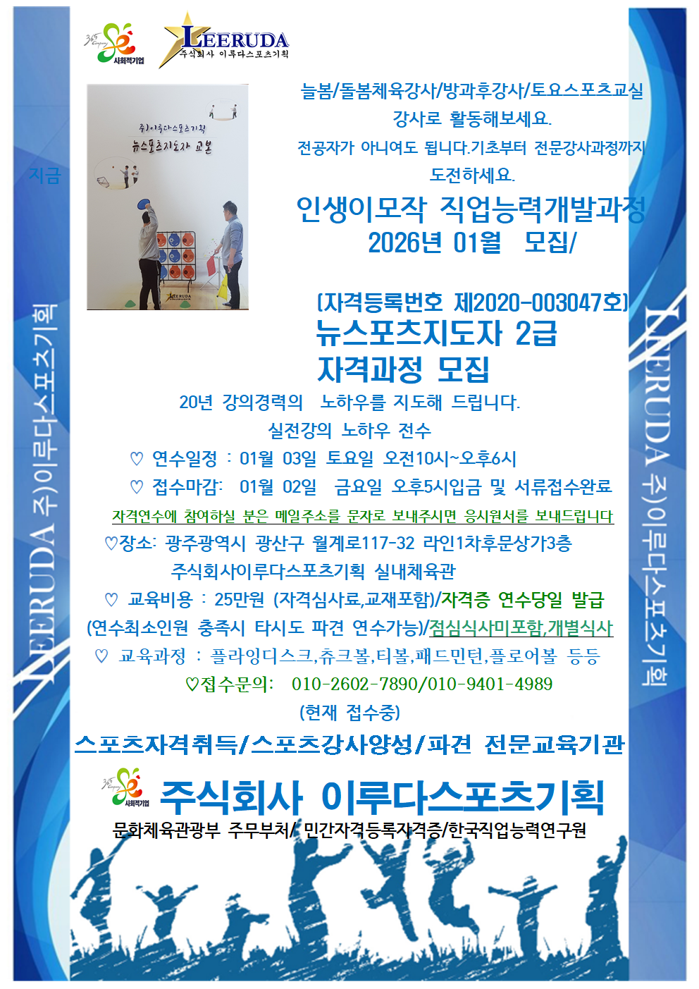| 158 | 2025년11월모집 뉴스포츠지도자 4회차 강의/현재모집중/ 광주북구여성인력개발센터 | 이루다스포츠기획 | 2025.10.28 | |