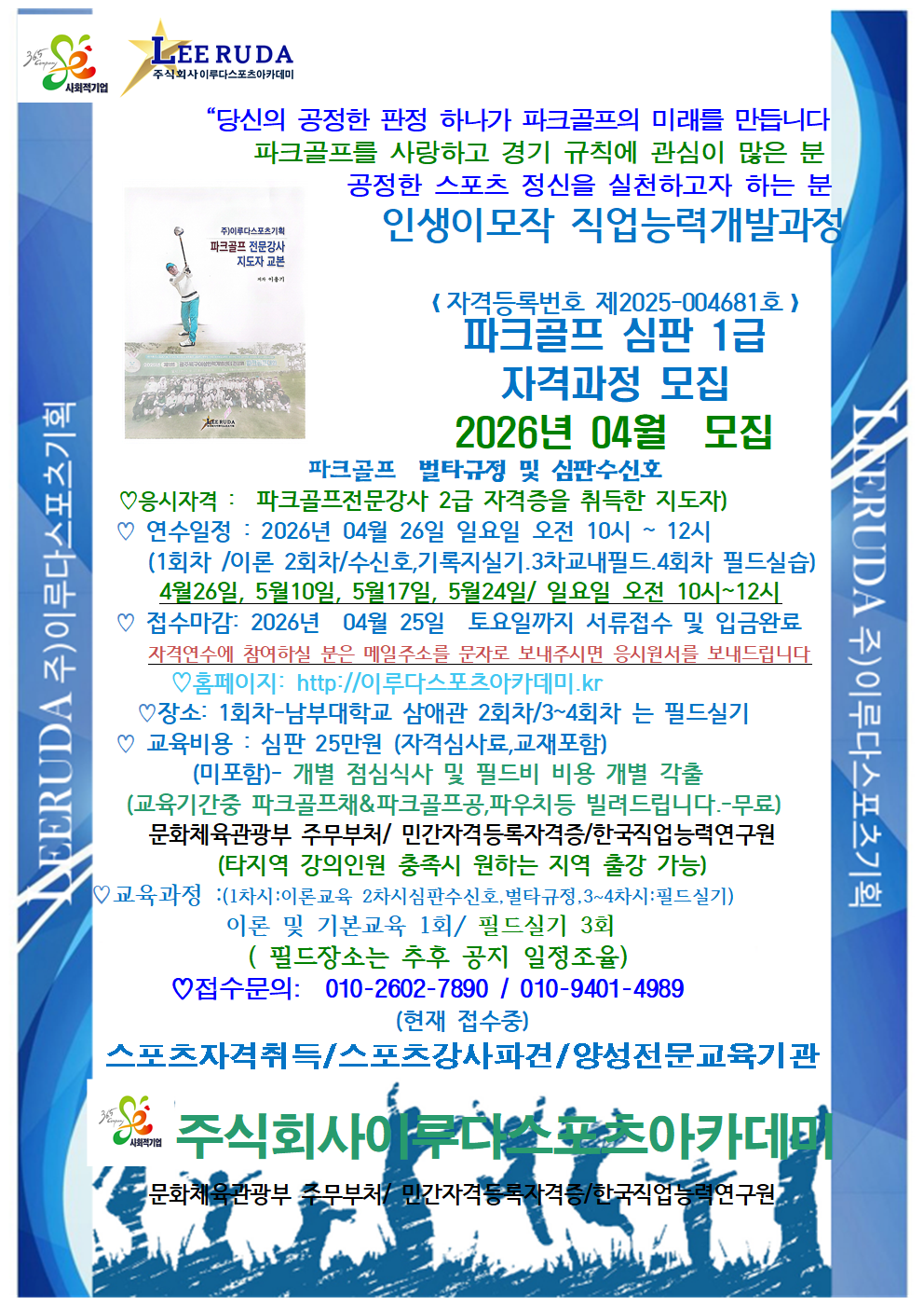 | 177 | 새글 파크골프 심판 1급 자격과정 모집 2026년 04월 모집 4월 26일 개강 | 이루다스포츠기획 | 2026.04.23 | |